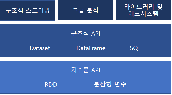 스파크는 저수준의 API, 구조적 API, 그리고 추가로 제공하는 일련의 표준 라이브러리로 구성되어 있다.